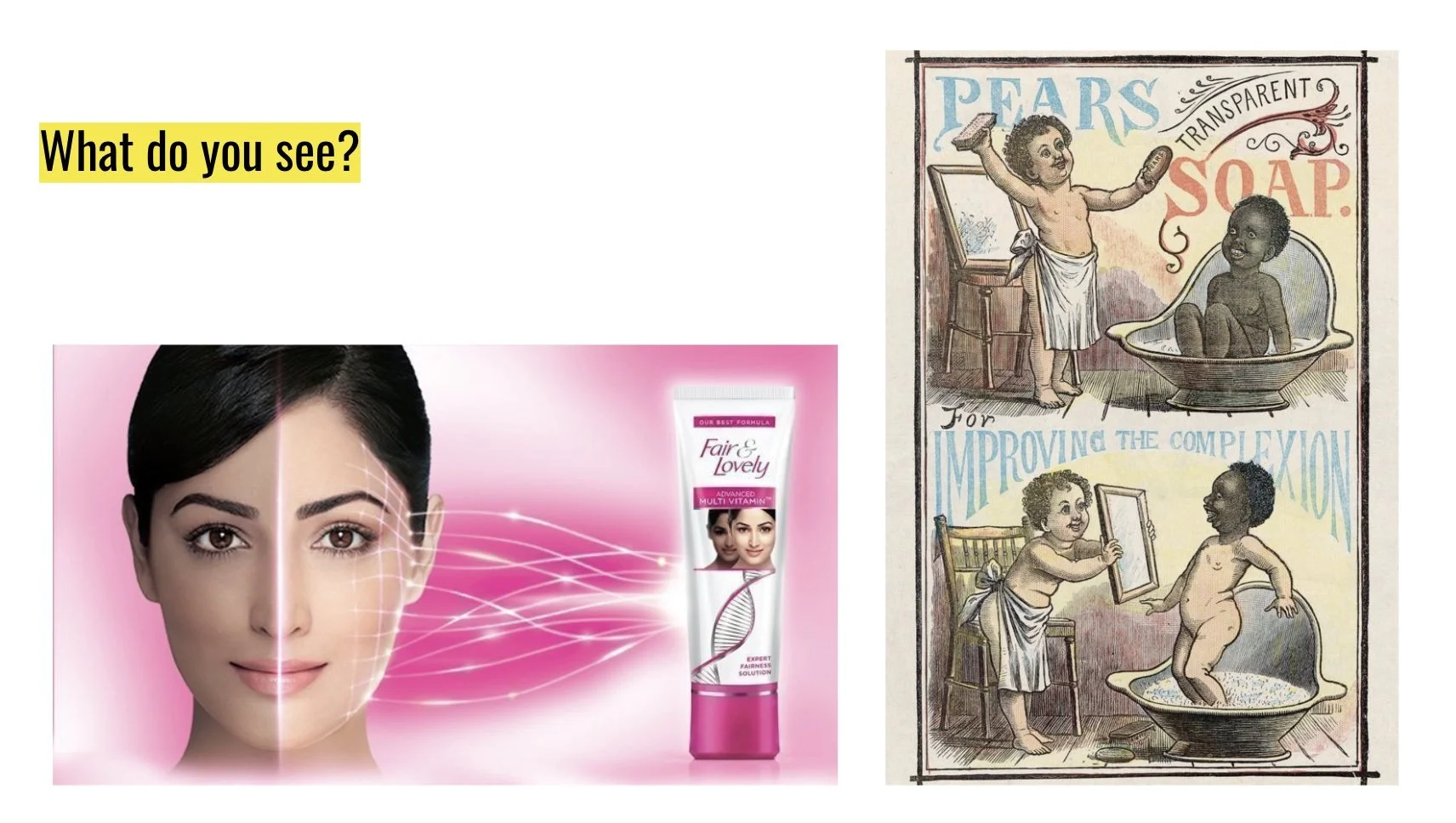 An example of some of the beauty ads from different periods and places we put side by side to have kids analyze the long, global history of colorism.